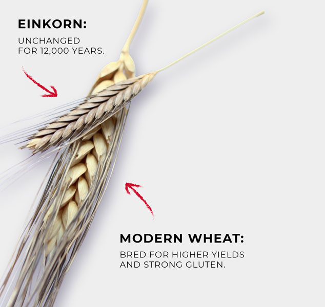 Have you ever wondered why all of the sudden wheat has been making people sick? Well, in the 1950s scientists figured out a way to create a wheat crop (by cross-breeding) that would be disease-resistant and produce higher yields. The man who engineered the new wheat won the Nobel Prize- it promised to feed millions around the world. Well, it has, and it has also made many sick. Einkorn is the ancient wheat grain, prior to hybridization.